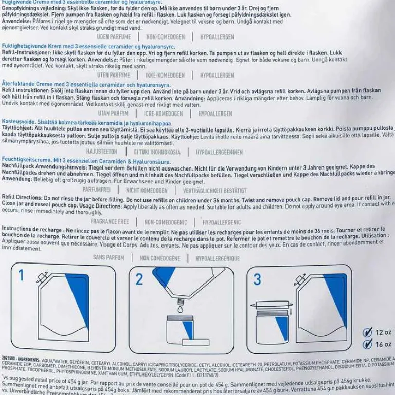 AQUA / WATER • GLYCERIN • CETEARYL ALCOHOL • CAPRYLIC/CAPRIC TRIGLYCERIDE • CETYL ALCOHOL • CETEARETH-20 • PETROLATUM • POTASSIUM PHOSPHATE • CERAMIDE NP • CERAMIDE AP • CERAMIDE EOP • CARBOMER • DIMETHICONE • BEHENTRIMONIUM METHOSULFATE • SODIUM LAUROYL LACTYLATE • SODIUM HYALURONATE • CHOLESTEROL • PHENOXYETHANOL • DISODIUM EDTA • DIPOTASSIUM PHOSPHATE • TOCOPHEROL • PHYTOSPHINGOSINE • XANTHAN GUM • ETHYLHEXYLGLYCERIN (F.I.L. D213768/2).