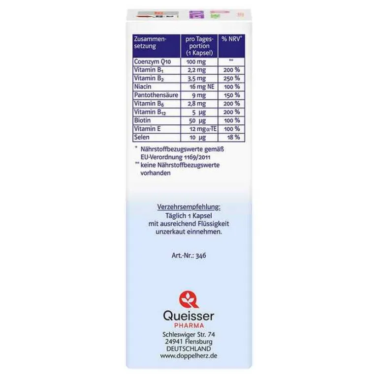 Doppelherz system Coenzym Q10 100 + Vitamine unterstützt mit B-Vitaminen den Energiestoffwechsel und leistet mit Vitamin E und Selen einen Beitrag für den Zellschutz.*