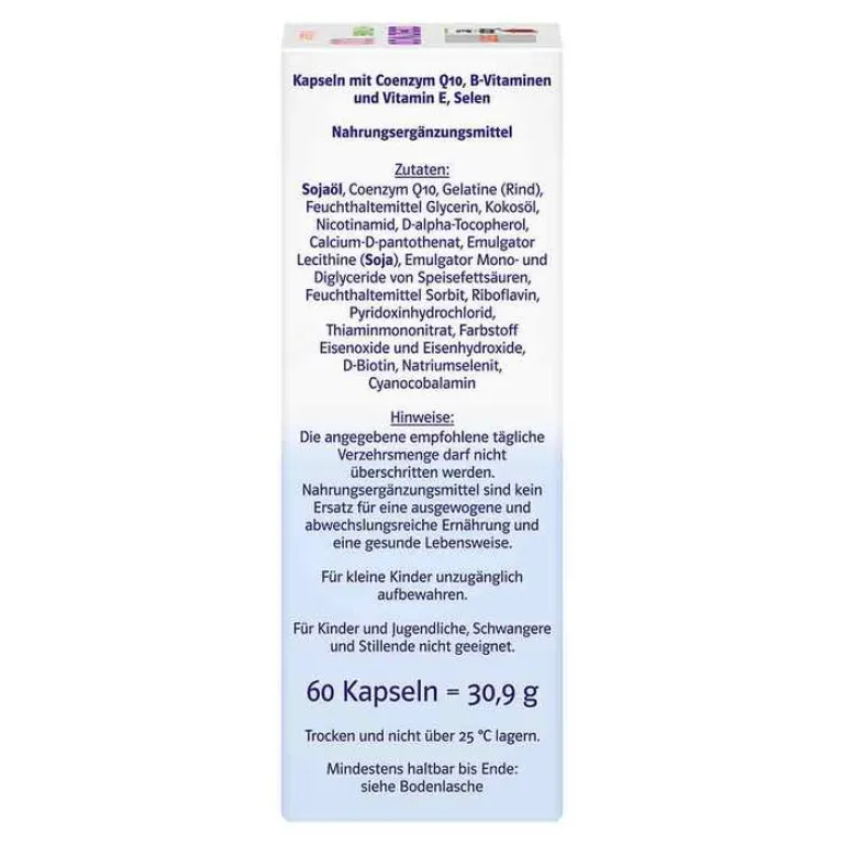 Sojaöl, Coenzym Q10, Gelatine (Rind), Feuchthaltemittel Glycerin, Kokosöl, Nicotinamid, D-alpha-Tocopherol, Nicotinamid, Calcium-D-pantothenat, Emulgator Lecithine (Soja), Emulgator Mono- und Diglyceride von Speisefettsäuren, Feuchthaltemittel Sorbit, Riboflavin, Pyridoxinhydrochlorid, Thiaminhydrochlorid, Farbstoff Eisenoxide und Eisenhydroxide, D-Biotin, Natriumselenit, Cyanocobalamin.