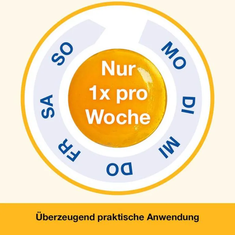 - kleine, leicht schluckbare Weichkapseln: Anwendung nur 1 x pro Woche