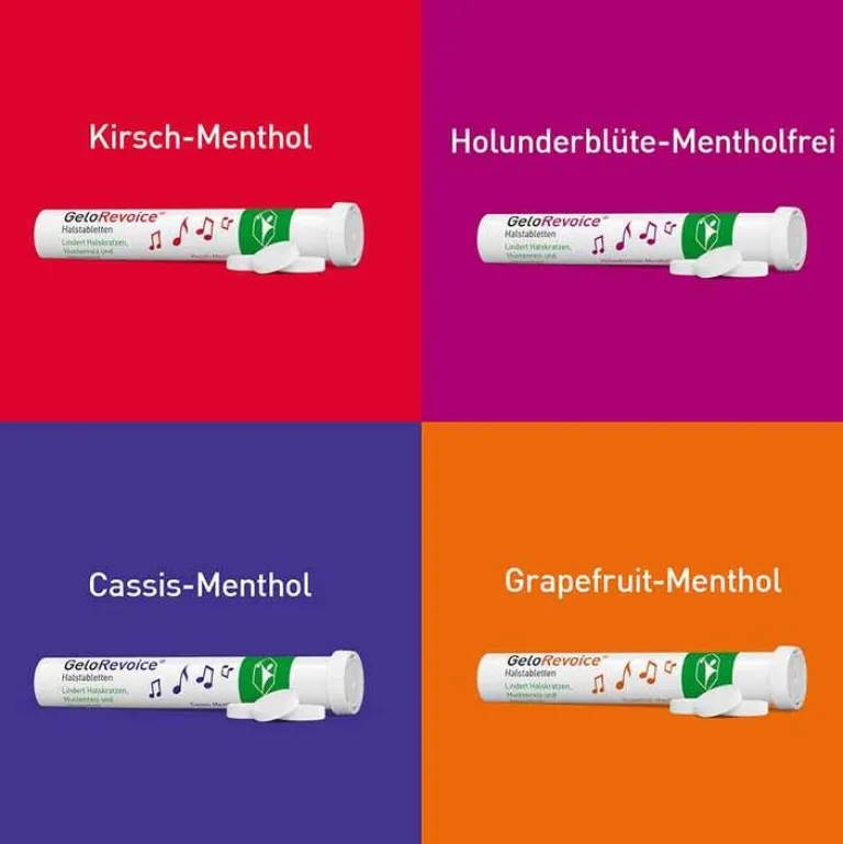 GeloRevoice® gibt es in den vier Geschmacksvarianten: fruchtiges Kirsch-Menthol, aromatisches Cassis-Menthol und frisches Grapefruit-Menthol sowie liebliches Holunderblüte-Mentholfrei.