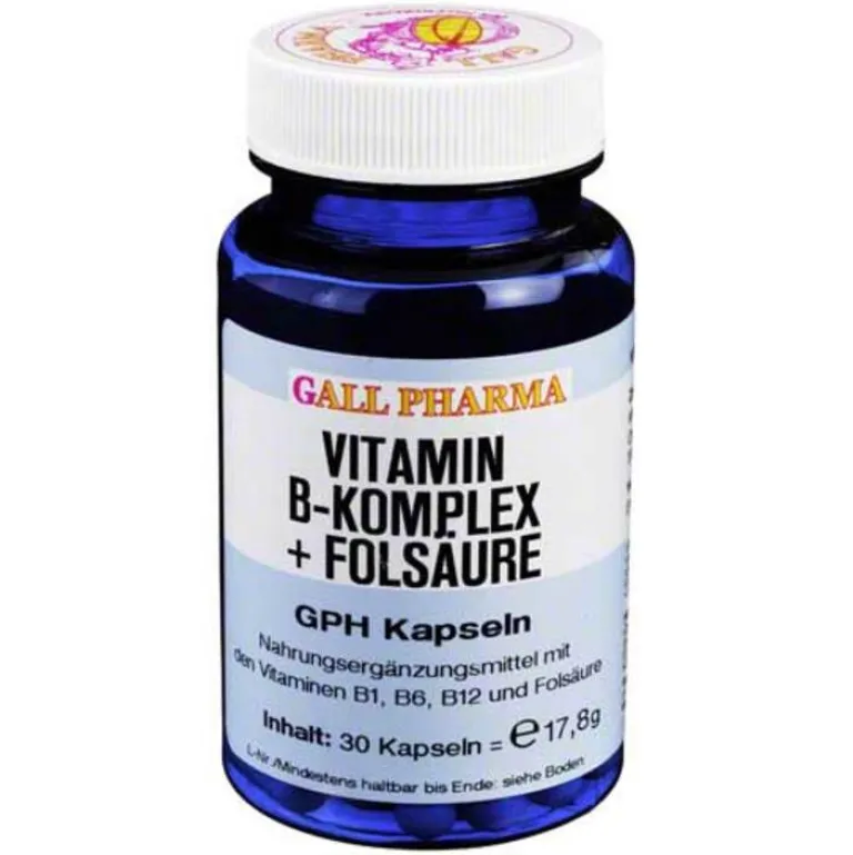 Vitamin B-Komplex + Folsäure GPH Kapseln enthalten 1,4 mg Vitamin B1 (Thiaminhydrochlorid), 2 mg Vitamin B6 (Pyridoxinhydrochlorid), 3 µg Vitamin B12 (Cyancobalamin) und 300 µg Folsäure in drei Hartgelatinekapseln. Die Gruppe der B-Vitamine wird auf Grund ihrer Wasserlöslichkeit im Körper nicht gespeichert und sollte durch die Nahrung oder Ergänzungen ausreichend zugeführt werden.
