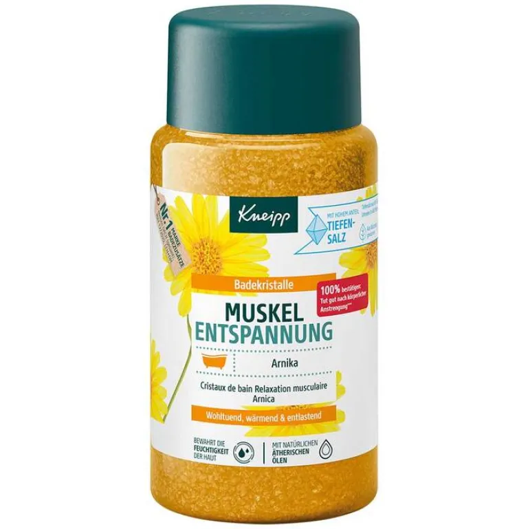 Die Kneipp Badekristalle Muskel Entspannung mit wertvollem Extrakt der Arnika und natürlichen ätherischen Ölen aus Cabreuva, Rosmarin und Pinus-Arten schenken ein wohltuendes, wärmendes und entlastendes Badeerlebnis und bewahren die Feuchtigkeit der Haut. Im Zusammenspiel mit der wohltuenden Wirkung warmen Wassers entfalten die ätherischen Öle in ihrer Kombination ihre natürliche Duftwirkung.