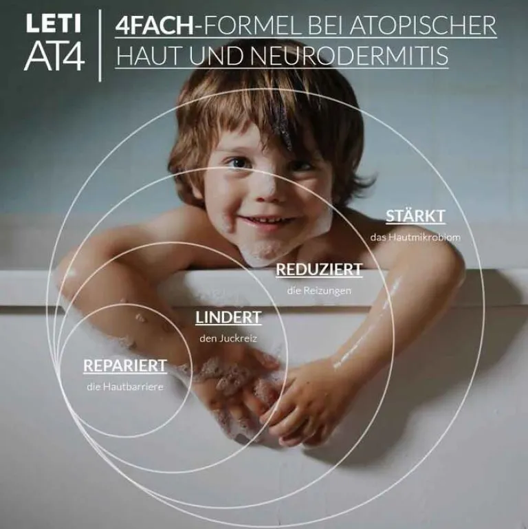 LETIAT4 Dusch- & Badegel lindert die 4 Symptome atopischer Haut: es stellt die Hautbarriere wieder her, lindert Juckreiz, schützt vor reizenden Einflüssen und reduziert das Risiko von Superinfektionen, indem das Mikrobiom der Haut ins Gleichgewicht gebracht wird.