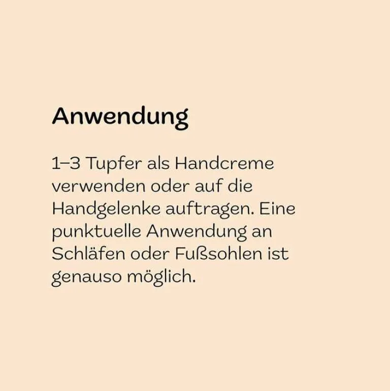 Wo, wie viel, wann: Spüre, was Dir gut tut und entscheide selbst. Unser Tipp: 1–3 Tupfer als Handcreme verwenden oder auf die Handgelenke auftragen. Eine punktuelle Anwendung an Schläfen oder Fußsohlen ist genauso möglich.