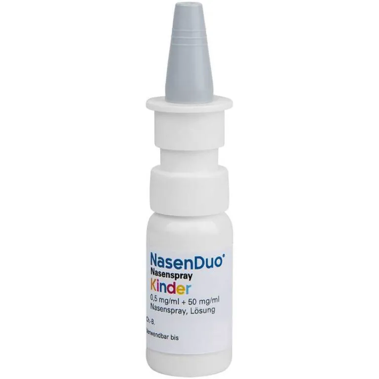 NasenDuo® Nasenspray Kinder. Anwendungsgebiete: Zur Abschwellung der Nasenschleimhaut bei Schnupfen und zur unterstützenden Behandl. der Heilung von Haut- und Schleimhautschäden, anfallsweise auftretendem Fließschnupfen und zur Behandl. der Nasenatmungsbehinderung nach operativen Eingriffen an der Nase. -Nasenspray 1 mg/ml + 50 mg/ml Nasenspray ist für Erwachsene und Kinder ab 6 Jahren -Nasenspray Kinder 0,5 mg/ml + 50 mg/ml Nasenspray ist für Kinder zwischen 2 und 6 Jahren. Apothekenpflichtig. Zu Risiken und Nebenwirkungen lesen Sie die Packungsbeilage und fragen Sie Ihre Ärztin, Ihren Arzt oder in Ihrer Apotheke. 3/23.