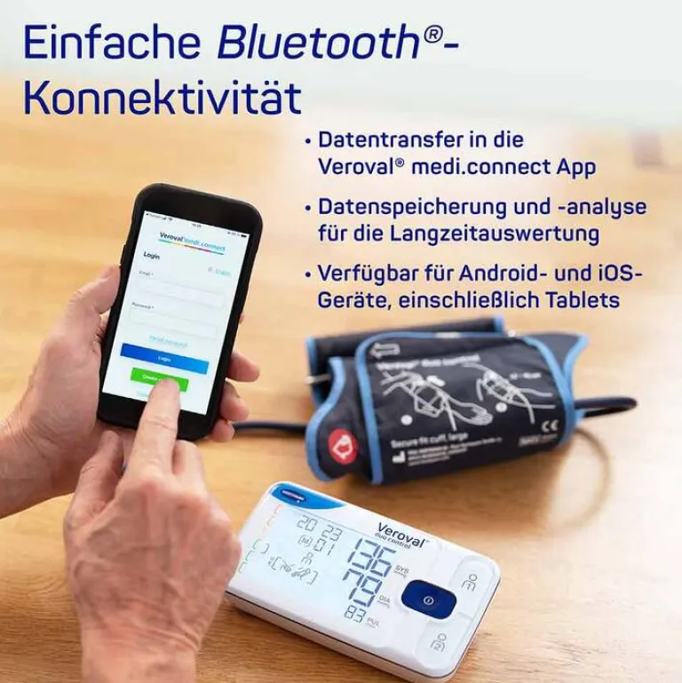 - EINFACHE BLUETOOTH® KONNEKTIVITÄT: Schnelle und einfache Datenübertragung auf die Veroval® medi.connect App, Datenspeicherung und Analyse für Langzeitauswertung, verfügbar für Android- und iOS-Geräte einschließlich Tablets