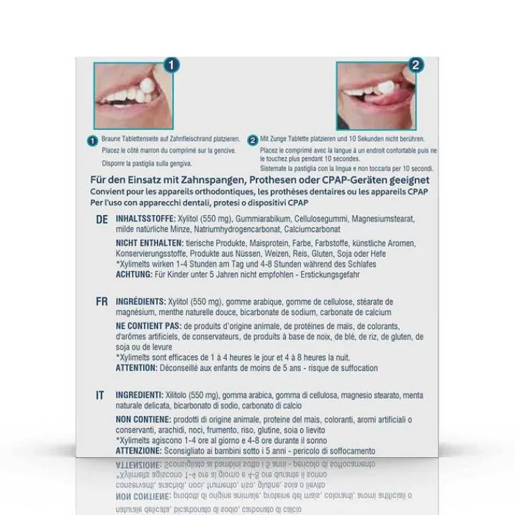 Je nach gewünschter Wirkung können Sie eine oder auch zwei OraCoat XyliMelts® verwenden – jeweils eine auf jeder Seite des Mundes. Sie können die Tabletten am Tag, aber insbesondere auch in der Nacht problemlos anwenden. Dank der patentierten Hafttechnik sind OraCoat XyliMelts® auch für den Einsatz mit CPAP-Geräten, Zahnspangen oder Prothesen geeignet.