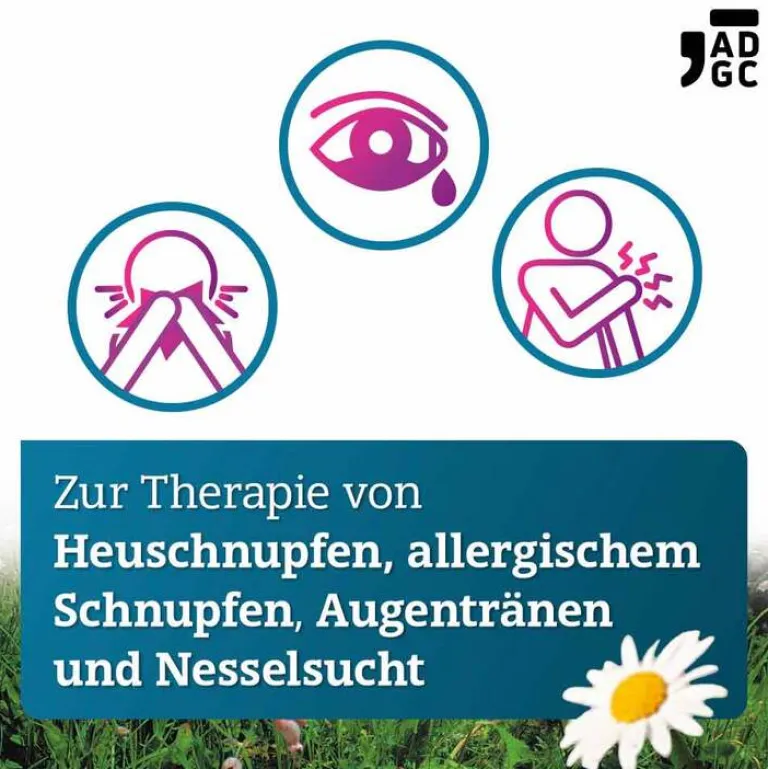 CETIRIZIN ADGC® Wirkstoff: Cetirizindihydrochlorid 10 mg. Anwendungsgebiete: Bei Erwachsenen und Kindern ab einem Alter von 6 Jahren ist Cetirizin-ADGC® angezeigt zur Linderung von Nasen- und Augensymptomen bei saisonaler und ganzjähriger allergischer Rhinitis (Heuschnupfen) und zur Linderung von chronischer Nesselsucht (chronischer idiopathischer Urtikaria). Warnhinweis: Enthält Lactose! Apothekenpflichtig. Zu Risiken und Nebenwirkungen fragen Sie Ihre Ärztin, Ihren Arzt oder in der Apotheke. Zentiva Pharma GmbH, 65927 Frankfurt am Main Stand: August 2023.