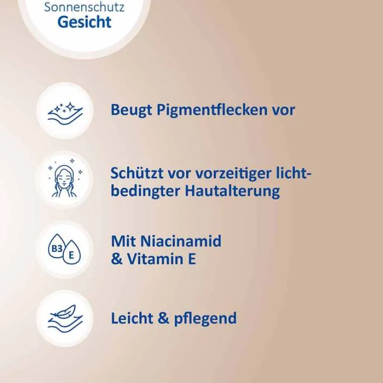Dank ihrer leichten und pflegenden Rezeptur zieht die Sonnenschutz-Creme schnell ein und bietet eine ideale Grundlage für Make-Up. Sie schützt Ihre Haut effektiv vor sonnenbedingten Zellschäden und beugt mit Niacinamid und Vitamin E Pigmentflecken und vorzeitiger lichtbedingter Hautalterung vor.