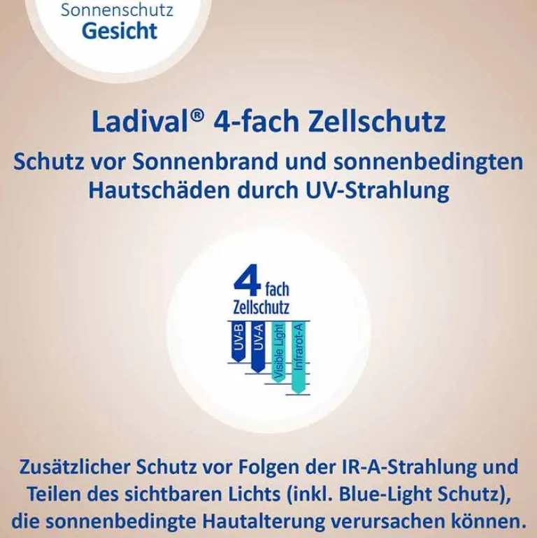 Sonnenstrahlen gibt es in verschiedenen Wellenlängen. Sie haben verschiedene Auswirkungen auf die Haut, wirken jedoch alle zellschädigend. Daher ist es wichtig einen Sonnenschutz zu verwenden, der rundum schützt. Dank einzigartigem 4-fach Zellschutz schützt die Ladival® Anti-Pigmentflecken Sonnenschutz-Creme vor UV-A- und UV-B-Strahlen, vor den Folgen der Infrarot-A-Strahlung und sichtbarem Licht (einschließlich blauem Licht). So wird die Haut auch vor einer vorzeitigen, sonnenbedingten Hautalterung geschützt.