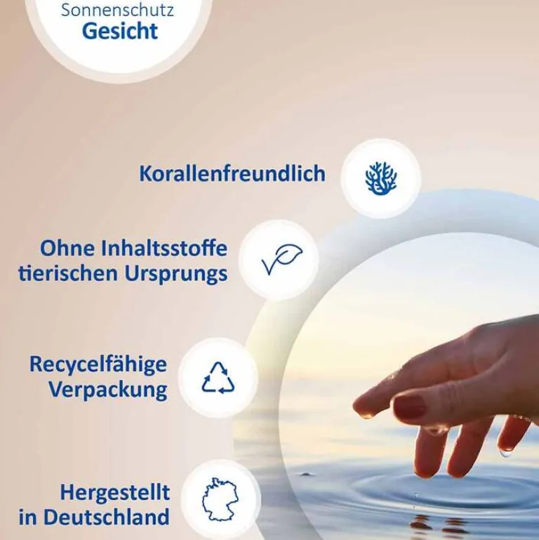 Tragen Sie die Sonnenschutz-Creme großzügig auf das Gesicht, den Hals, das Dekollete und die Hände auf. Vor dem Auftrag von Make-Up oder anderen Gesichtsprodukten gut einziehen lassen. Cremen Sie nach Bedarf nach – vor allem nach dem Baden oder Schwitzen. Zu wenig Sonnenschutzmittel verringert den Lichtschutzfaktor.
