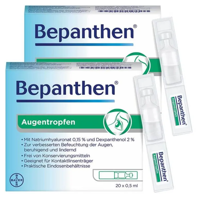 Wer an trockenen und gereizten Augen leidet, kann mit den Bepanthen® Augentropfen die Augenoberfläche befeuchten, den Tränenfilm stabilisieren und somit das Auge vor einem Trockenheitsgefühl schützen. Auf diese Weise wird eine Linderung der Beschwerden erreicht. Die Bepanthen® Augentropfen sind erhältlich als Ein-Dosis-Behältnis (praktisch für unterwegs) und in der Soft-Touch-Mehrdosisflache (insbesondere zur regelmäßigen Anwendung). Die Augentropfen enthalten weder Konservierungsstoffe noch Phosphate. Sie sind für Kontaktlinsenträger geeignet.