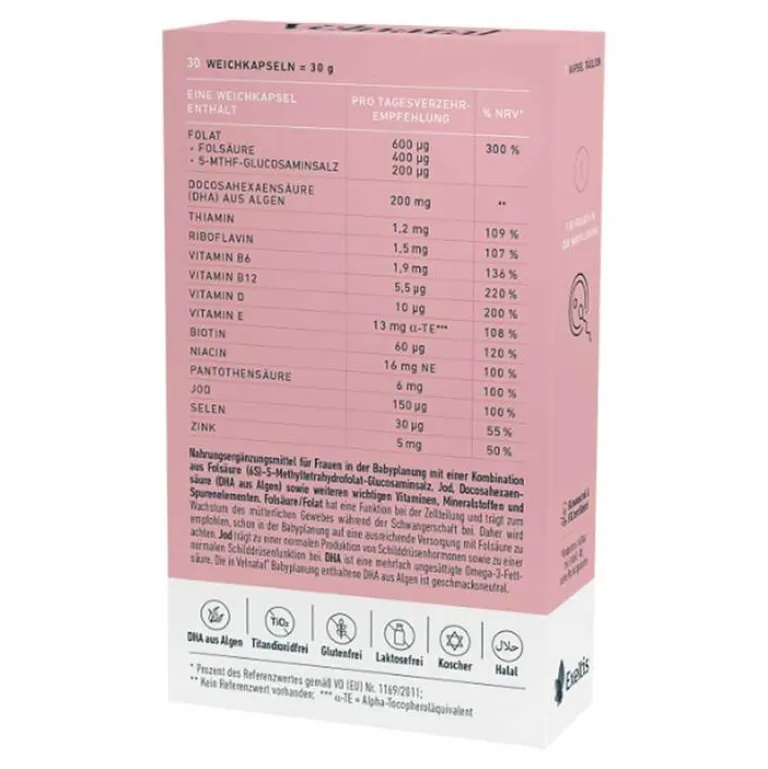 Velnatal® Babyplanung ist ein Nahrungsergänzungsmittel, das speziell auf deine Bedürfnisse in der Babyplanungsphase abgestimmt ist.