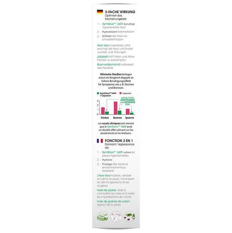 - SymSitive® 1609: vermindert Überreaktionen der Haut und wirkt dadurch hautberuhigend. Reduziert signifikant Hautempfindungen wie beispielsweise Brennen, Stechen und Hautspannungen.