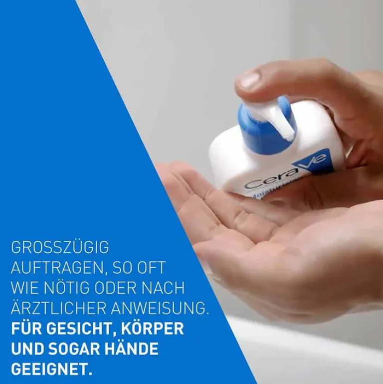 Die Feuchtigkeitslotion von CeraVe kann beliebig oft und großzügig auf die gereinigte Haut von Gesicht und Körper aufgetragen werden.