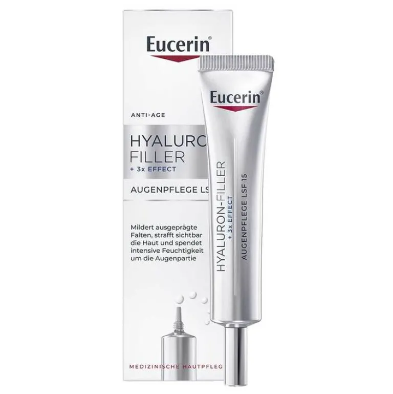 Die Eucerin® Hyaluron-Filler + 3x Effect Augenpflege LSF 15 15 ml wurde speziell für die Minderung von Fältchen sowie Krähenfüßen an der zarten Augenpartie entwickelt. Mit zunehmendem Alter nimmt die hauteigene Produktion von Hyaluronsäure und Kollagen ab. Die Haut verliert an Spannkraft und es bilden sich Falten.