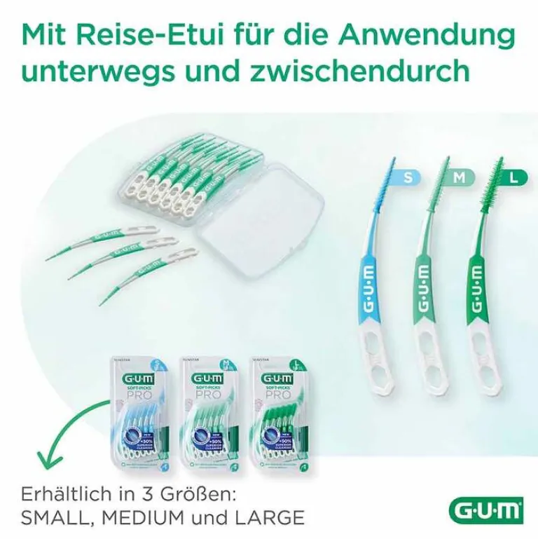 GUM Soft-Picks Pro ist die neueste Innovation im GUM Interdentalsortiment und eignet sich hervorragend für die tägliche Reinigung der Zahnzwischenräume vor dem Zähneputzen mit einer Zahnbürste. Der Kopf wurde neu gestaltet, ist ultraweich und reinigt 50% effektiver* zwischen den Zähnen, also in den Bereichen, die eine Zahnbürste nicht erreicht. Auch die hinteren Zahnzwischenräume werden durch die leicht gebogene Form einfach erreicht.