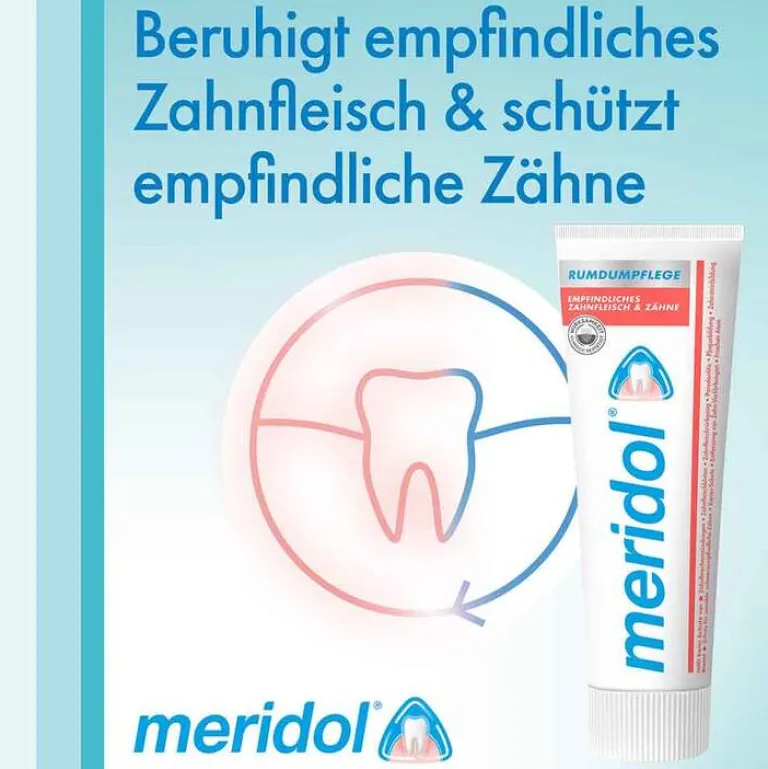 Die Meridol Rundumpflege Zahnpasta bietet Schutz für schmerzempfindliche Zähne, Schutz vor Karies, die Entfernung von Zahn-Verfärbungen und einen frischen Atem.