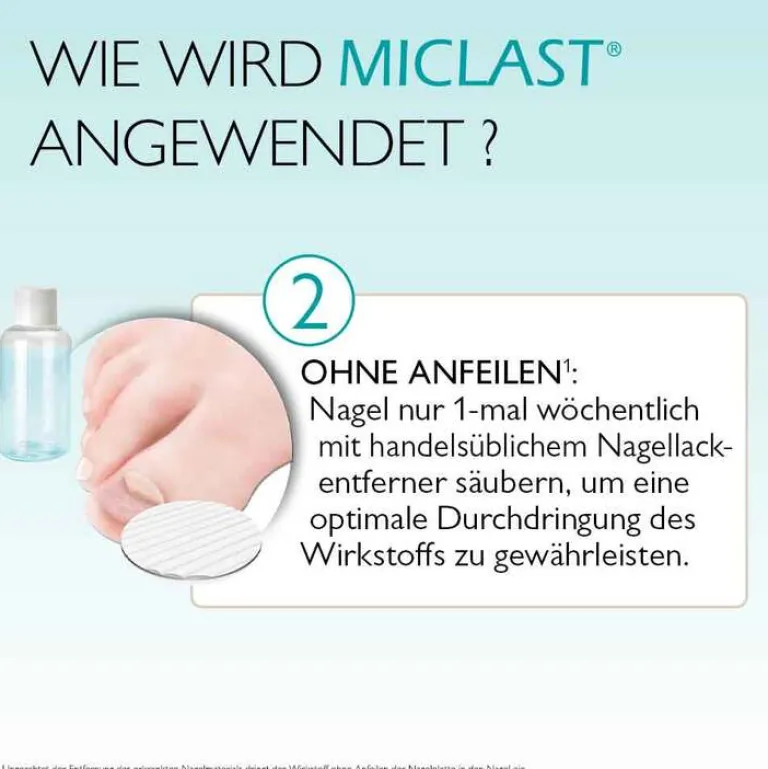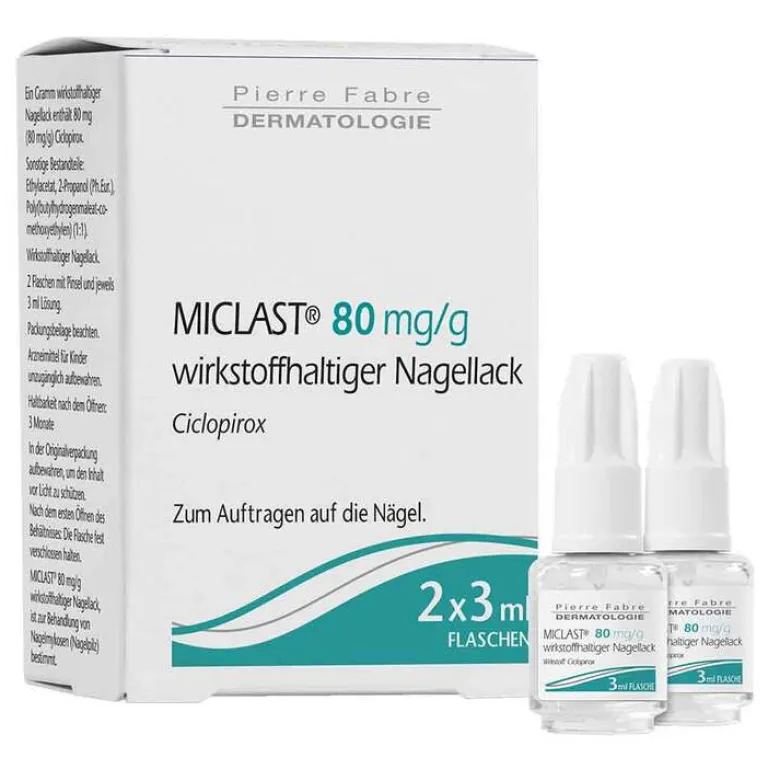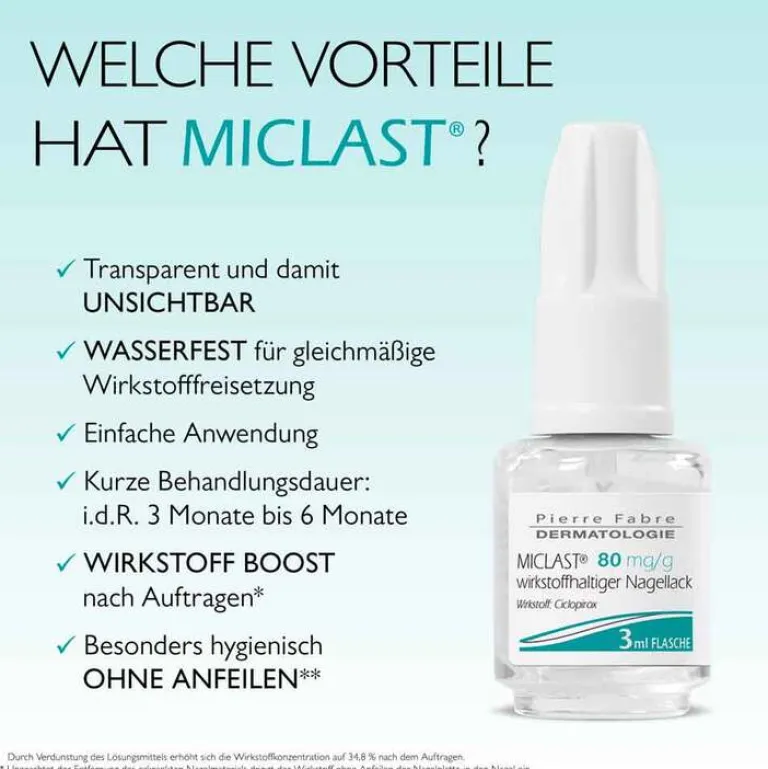 MICLAST® 80 mg/g wirkstoffhaltiger Nagellack. Wirkstoff: Ciclopirox. Anwendungsgebiet: Behandlung von leichtem bis mittelschwerem Nagelpilz-Befall (Onychomykose) der Finger- und Zehennägel. Der Wirkstoff Ciclopirox dringt in den Nagel ein und tötet die Pilze ab. Zu Risiken und Nebenwirkungen lesen Sie die Packungsbeilage und fragen Sie Ihre Ärztin, Ihren Arzt oder in Ihrer Apotheke.