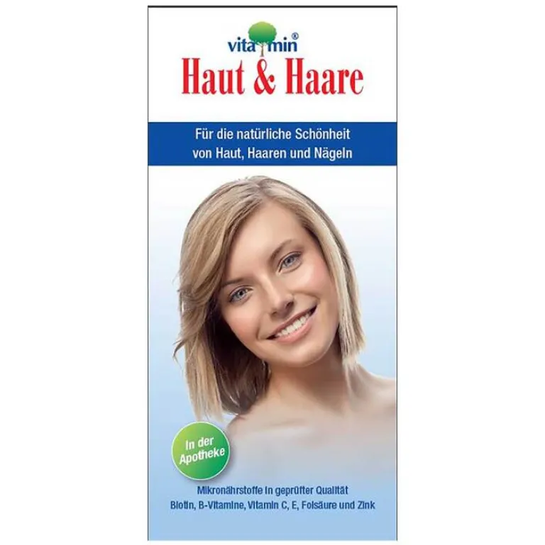 Bei unausgewogener Ernährung oder bei erhöhtem Bedarf, z. B. durch Stress, kann es bei wichtigen Vitaminen und Spurenelementen zu Versorgungslücken kommen. Unsere Haut, Fingernägel und insbesondere die Haare leiden besonders darunter. Mit Haut & Haare Vitamin können Sie Ihre Ernährung mit sinnvoll aufeinander abgestimmten Vitaminen und Zink ergänzen und Ihren Haaren, Fingernägeln und Ihrer Haut etwas Gutes tun.*