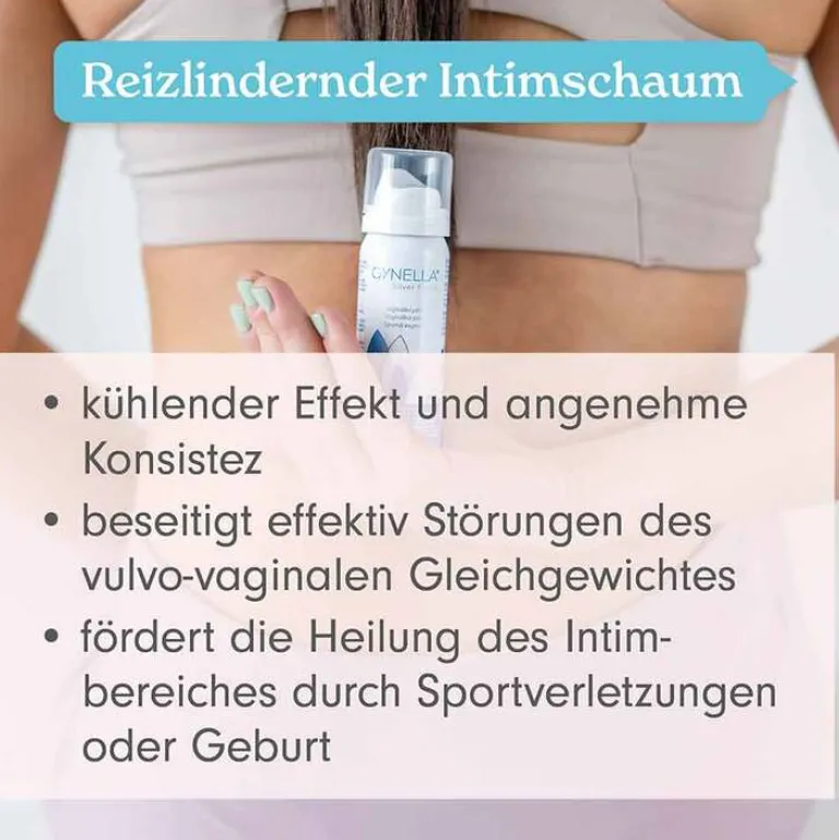 Der GYNELLA® Silver Foam ist ein schnell einziehender, lindernder Vaginalschaum. Der vielseitig einsetzbare, innovative Schaum lindert Reizungen wie sie z.B. bei Infektionen entstehen. Er unterstützt die Heilung von Verletzungen nach der Geburt, beim Sport oder bei anderen Aktivitäten. GYNELLA® Silver Foam wirkt aufgrund vielfältiger Effekte. Die Hauptwirkung beruht auf der Bildung einer Schutzbarriere im äußeren Genitalbereich, die das Gewebe vor äußeren Reizungen schützt. Spüren Sie die Wirkung des Schaums mit dem patentierten Silber-Komplex mit seinen antimikrobiellen, heilungsfördernden und reizlindernden Eigenschaften. Hyaluron und Malvenextrakt sorgen für ein weiches Gefühl und eine Befeuchtung der Schleimhaut für eine ausgeglichene Mikroflora.