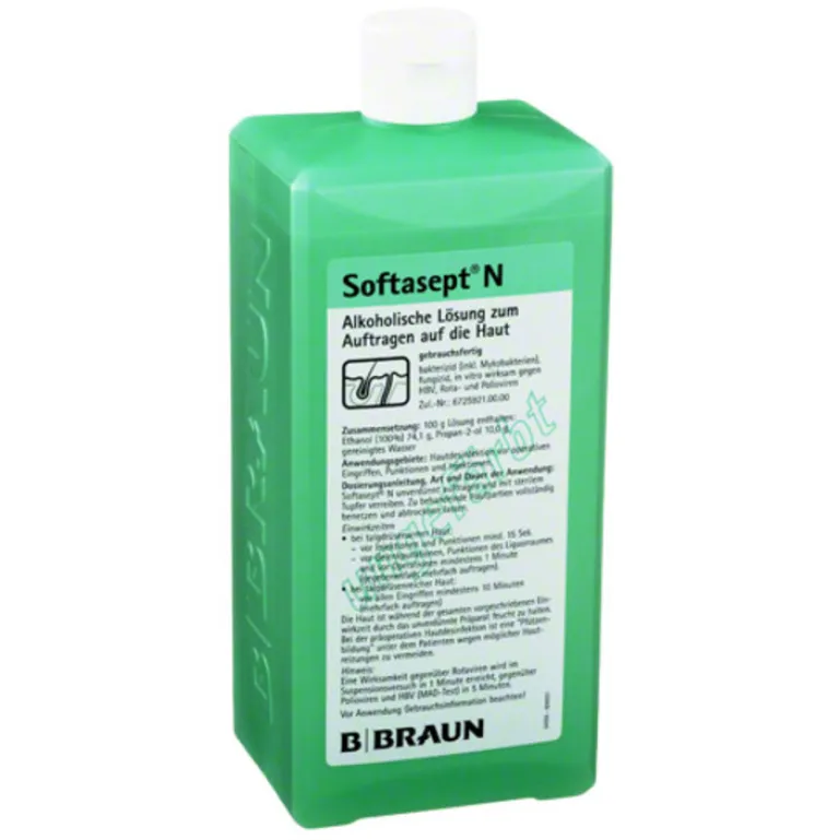 Softasept® N. Zusammensetzung: 100 g Lösung enthalten: Arzneilich wirksame Bestandteile: Ethanol (100 %) 74,1 g, 2-Propanol (Ph. Eur.) 10,0 g Sonstige Bestandteile: gereinigtes Wasser. Anwendungsgebiete: Hautdesinfektion vor operativen Eingriffen, Punktionen und Injektionen. Gegenanzeigen: Überempfindlichkeit (Allergie) gegenüber Ethanol oder 2-Propanol. Softasept® N ist nicht für die Antiseptik von Schleimhäuten und zur Anwendung in unmittelbarer Umgebung der Augen geeignet. Warnhinweise: Leicht entzündlich. Behälter dicht geschlossen halten. Von Zündquellen fernhalten. Nicht rauchen! Nicht in offene Flamme sprühen! Nicht in die Augen bringen. Nicht auf verletzter Haut oder auf Schleimhäuten anwenden. Nur zum äußerlichen Gebrauch bestimmt. 14 °C Flammpunkt nach DIN 51755. Nebenwirkungen: Insbesondere bei häufiger Anwendung kann es zu Hautirritationen wie Rötung und Brennen kommen. Auch sind Kontaktallergien möglich. Stand der Information: 03/2011. Pharmazeutischer Unternehmer: B. Braun Melsungen AG 34209 Melsungen