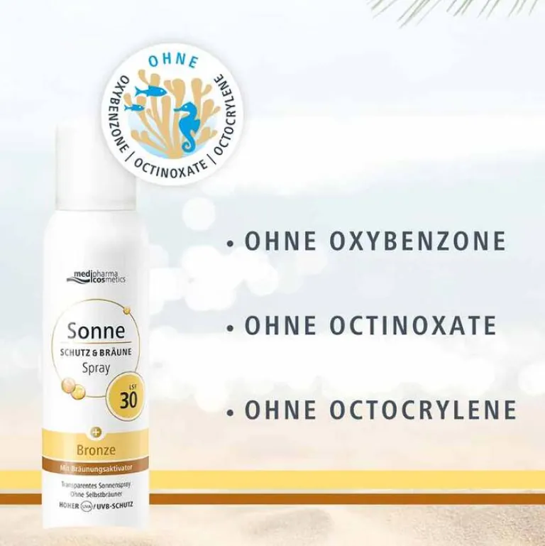 Das ultraleichte und transparente Sonnenspray Schutz & Bräune mit LSF 30 von Medipharma Cosmetics ist für Gesicht und Körper geeignet und bietet Sicherheit und Hautschutz auch bei intensiver Sonneneinstrahlung.