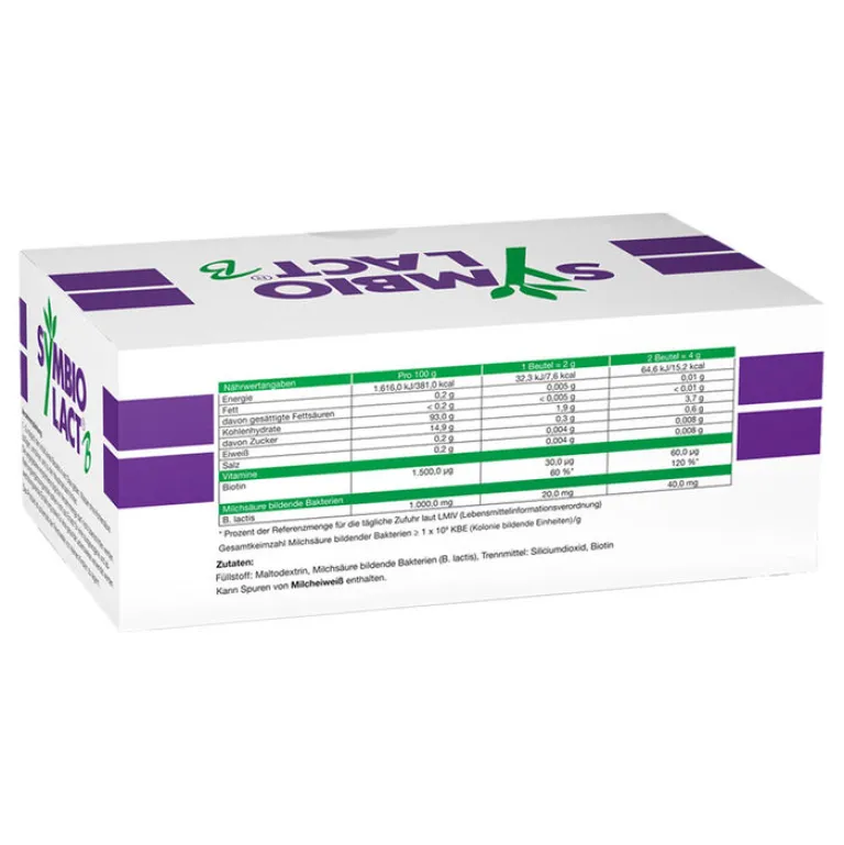 SymbioLact B ist ein Nahrungsergänzungsmittel mit Biotin und einem Stamm Milchsäure bildender Bakterien als wichtigen Vertretern der Darmflora. Die Bakterien in SymbioLact B sind gefriergetrocknet. Sobald sie mit Wasser in Kontakt kommen, werden sie aktiv und können sich vermehren.