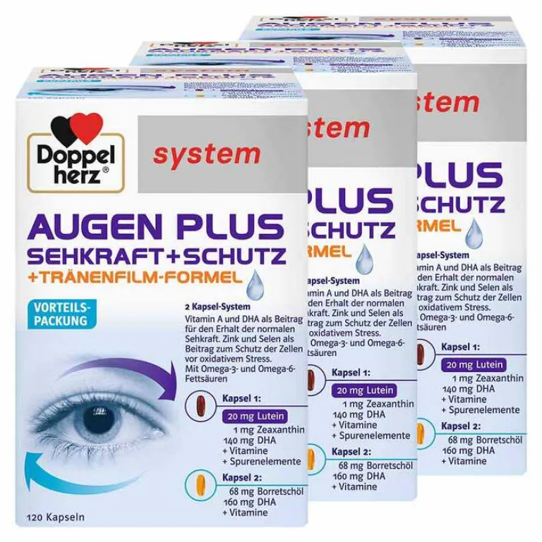 Die Augen Plus Sehkraft+Schutz +Tränenfilm-Formel von Doppelherz System enthält ausgesuchte Vitamine und Spurenelemente und mehrfach ungesättigte Fettsäuren in zwei Sorten Kapseln.