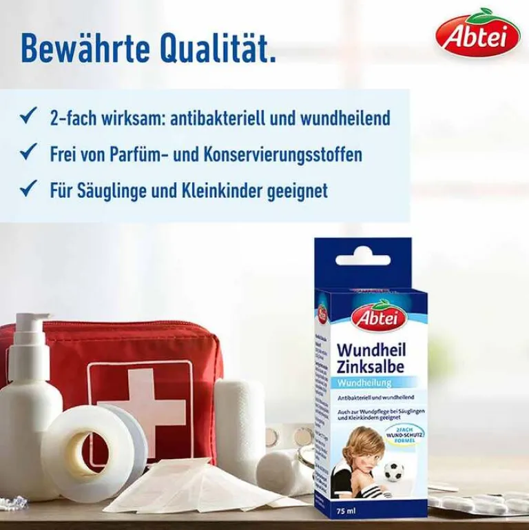 Die Abtei Wundheil Zinksalbe kommt mit nur wenigen Inhaltsstoffen aus und eignet sich daher auch für die Wundheilung der Haut von Babys und Kindern. Ihre Wund-Schutz-Formel wirkt 2-fach: antibakteriell und wundheilend. Das enthaltene Zink hemmt dabei das Bakterienwachstum und beugt Entzündungen vor.