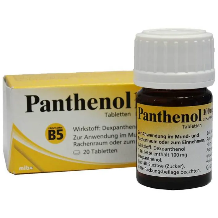 Panthenol 100 mg JENAPHARM® Wirkstoff: Dexpanthenol. Anwendungsgebiete: Anwendung bei Jugendlichen ab 12 Jahren und Erwachsenen zur unterstützenden Behandlung bei Entzündungen der Mund- und Rachenschleimhaut und zur Behandlung von Pantothensäure-Mangelzuständen, die ernährungsmäßig nicht zu beheben sind, wie z. B. Supplementierung bei chronischen Dialysepatienten und durch Pantothensäure-Mangel bedingte Missempfindungen und Schmerzen in Zehen und Fußsohlen (Burning-Feet-Syndrom). Warnhinweis: Enthält Sucrose (Zucker). Zu Risiken und Nebenwirkungen lesen Sie die Packungsbeilage und fragen Sie Ihre Ärztin, Ihren Arzt oder in Ihrer Apotheke. Stand: 04/2020. mibe GmbH Arzneimittel, 06796 Brehna.