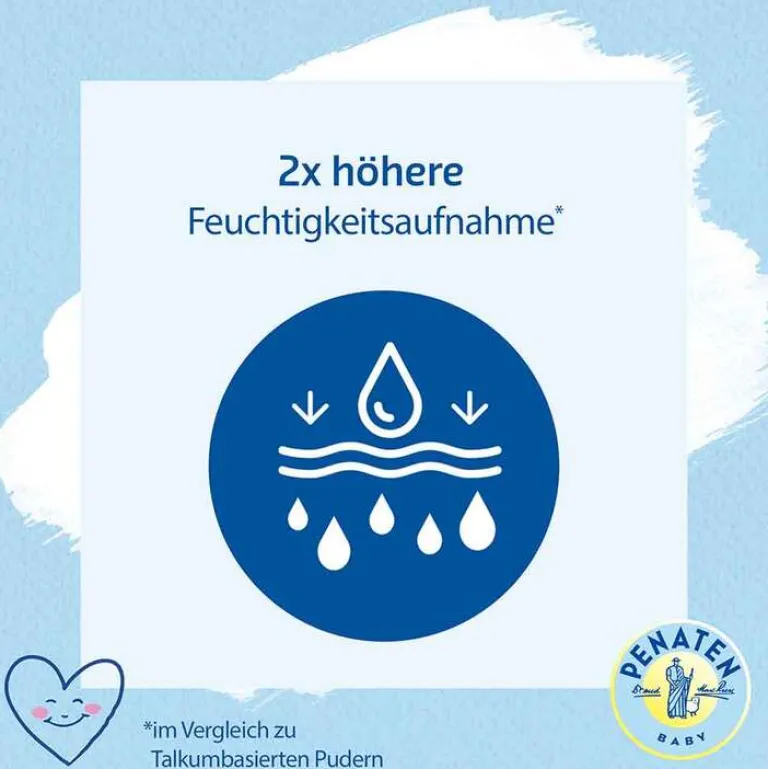 Dank seiner einzigartigen Formel nimmt das Baby Puder Feuchtigkeit auf und hält die Haut trocken und geschützt. Dermatologisch bestätigt und zu 99% natürlich, ist das Penaten Puder die ideale Wahl für Eltern, die auf der Suche nach einem sicheren und natürlichen Produkt sind.