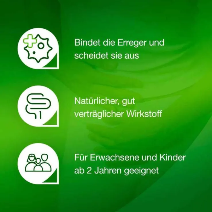 - Das Arzneimittel bindet die Durchfallerreger und unterstützt Ihren Darm dabei, die Erreger auszuscheiden. Dies trägt zur sanften Linderung der Beschwerden bei.