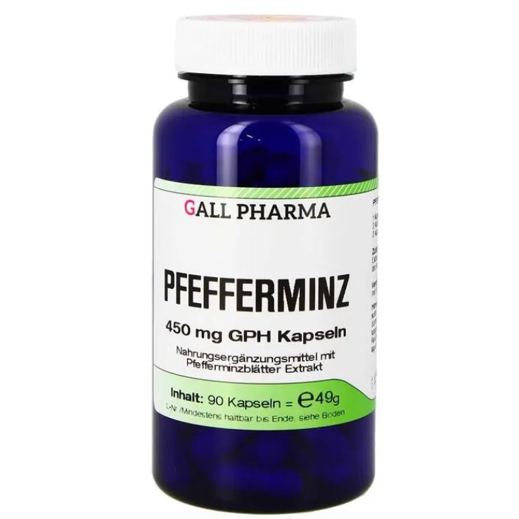 Pfefferminz 450 mg GPH Kapseln enthalten 450 mg Pfefferminz Trockenextrakt 4:1. Die Blätter enthalten ätherisches Öl, das entspannende Effekte auf die glatte Muskulatur des Verdauungstraktes ausübt, entblähende sowie antimikrobielle Eigenschaften hat und für den Gallefluss förderlich sein kann. Es hat sich daher bei krampfartigen funktionellen Magen- oder Gallenbeschwerden bewährt. Beim sogenannten Reizdarmsyndrom, das sich in zeitweise auftretenden Bauchschmerzen und einem Wechsel zwischen Verstopfung und Durchfall äußert, zeigt die Pfefferminze Linderung in Bezug auf die Magenbeschwerden, das Völlegefühl und krampfhafte Schmerzen.