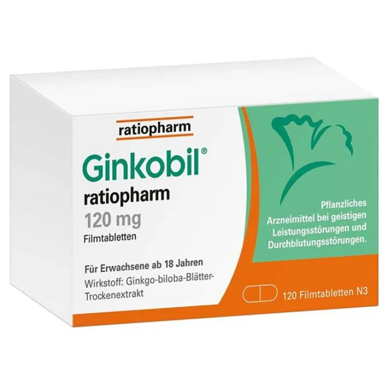 Ginkobil® ratiopharm 120 mg Filmtabletten. Wirkstoff: Ginkgo-biloba-Blätter-Trockenextrakt. Anwendungsgebiete: Zur symptomatischen Behandlung von hirnorganisch bedingten Leistungsstör. im Rahmen eines therapeutischen Gesamtkonzeptes bei Abnahme bzw. Verlust erworbener geistiger Fähigkeiten (dementielles Syndrom) mit den Hauptbeschwerden: Gedächtnisstörungen, Konzentrationsstörungen, depressive Verstimmung, Schwindel, Ohrensausen, Kopfschmerzen. Verlängerung der schmerzfreien Gehstrecke bei peripherer arterieller Verschlusskrankheit bei Stadium II nach FONTAINE („Schaufensterkrankheit“) im Rahmen physikalisch-therapeutischen Maßnahmen, insbesondere Gehtraining. Schwindel, Ohrgeräusche infolge Durchblutungsstörungen oder altersbedingten Rückbildungsvorgängen. Warnhinweis.: Filmtbl.: Arzneimittel enthält Lactose u. weniger als 1 mmol Natrium (23 mg) pro Filmtbl., d.h. es ist nahezu „natriumfrei“. Apothekenpflichtig. Zu Risiken und Nebenwirkungen lesen Sie die Packungsbeilage und fragen Sie Ihre Ärztin, Ihren Arzt oder in Ihrer Apotheke. 12/22.