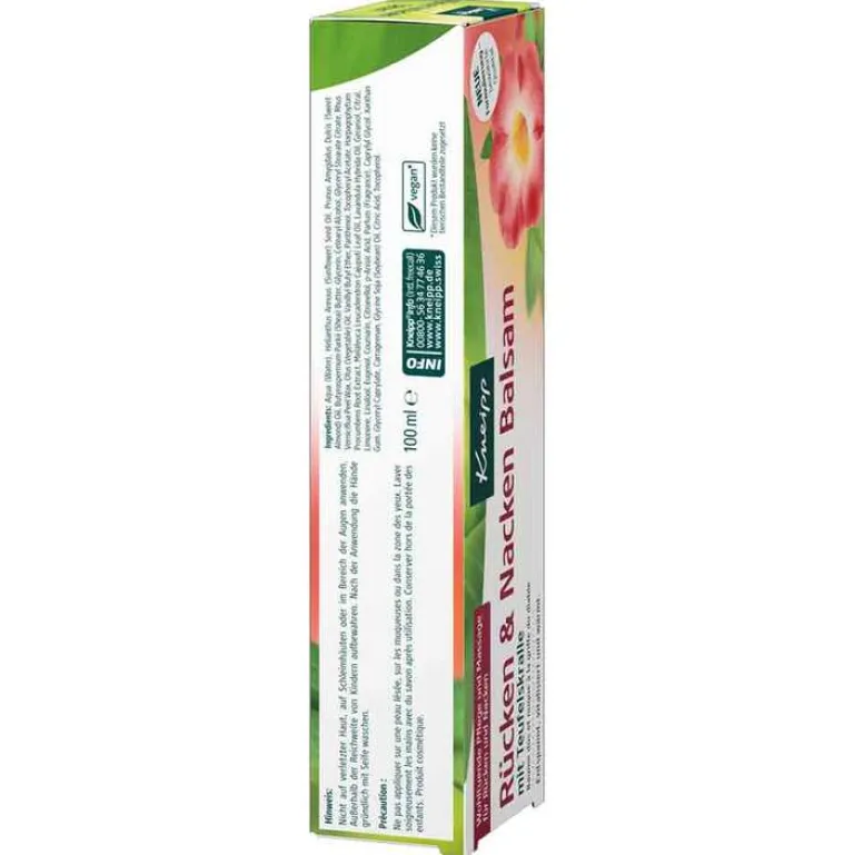 Der Kneipp Rücken & Nacken Balsam enthält wertvollen Teufelskrallenextrakt, natürliches ätherisches Cajeputöl und eine wohlriechende Duftkombination ätherischer Öle.