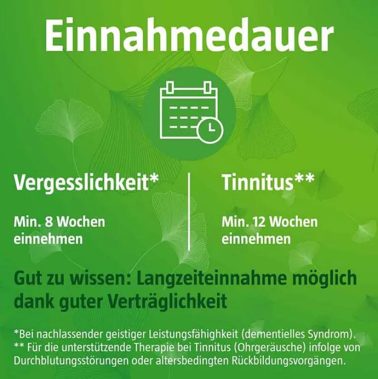 Zur Behandlung von Vergesslichkeita sollte die optimale Behandlungsdauer falls nicht anders verordnet mindestens 8 Wochen betragen. Nach einer Behandlungsdauer von 3 Monaten ist von der Ärztin oder vom Arzt zu überprüfen, ob die Weiterführung der Behandlung noch gerechtfertigt ist. Zur unterstützenden Behandlung von Ohrgeräuschenb sollte die optimale Behandlungsdauer falls nicht anders verordnet zwischen 12 Wochen und 6 Monaten liegen. Die unterstützende Behandlung sollte über einen Zeitraum von mindestens 12 Wochen erfolgen. Sollte nach 6 Monaten kein Erfolg eingetreten sein, ist dieser auch bei längerer Behandlung nicht mehr zu erwarten.