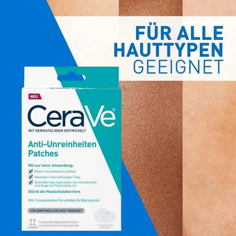 Die mit Dermatologen entwickelten Anti-Pickel-Patches eignen sich für jeden Hauttyp und sind allergiefreundlich. Optimale Ergebnisse erzielen die Patches in Kombination mit der CeraVe Porentiefen Reinigung.