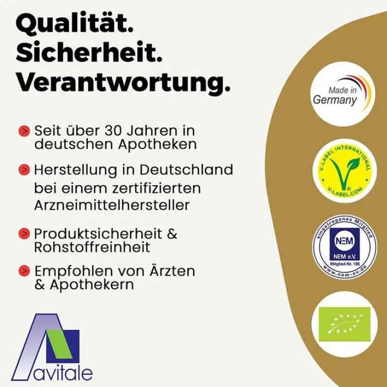 Avitale Coenzym Q10 Komplex Kapseln sind gluten-, soja- und hefefrei und werden ohne Einsatz von Gentechnik in Deutschland hergestellt.