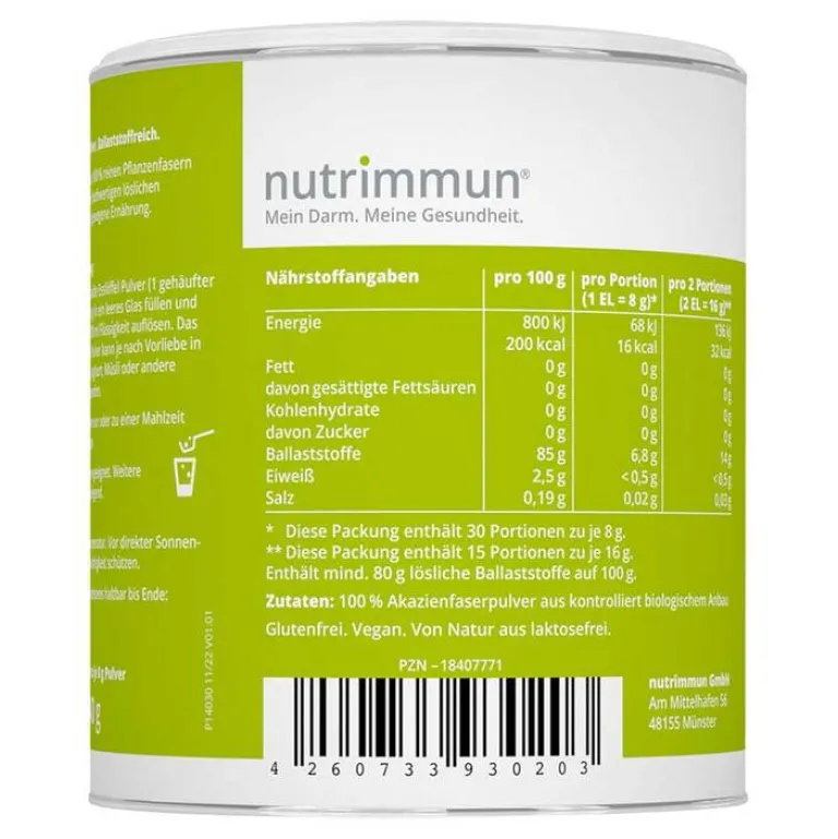 Mybiotic Biofibre Bio Akazienfaserpulver ist ein ballaststoffreiches Naturprodukt aus 100 % reinen Pflanzenfasern. Es enthält hochwertige lösliche Ballaststoffe, die eine ausgewogene Ernährung unterstützen. Ballaststoffe gehören zu einer gesunden Ernährung, da sie die Verdauung unterstützen, sättigend sind und der Darmflora als Nahrungsquelle dienen.