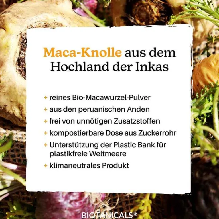 Biotanicals Maca Bio Kapseln sind mit 100 % natürlichen Zutaten ohne künstliche Zusätze. Die Zutaten sind in hochwertigen Vcaps der Marke Capsulgel verarbeitet. Die kompostierbare Dose aus Zuckerrohr schützt die Kapseln. Biotanicals verzichtet auf Plastik und Glas. Der verwendete Zuckerrohr stammt aus Bonsucro-zertifiziertem Anbau. Das Produkt ist nachhaltig und klimaneutral.