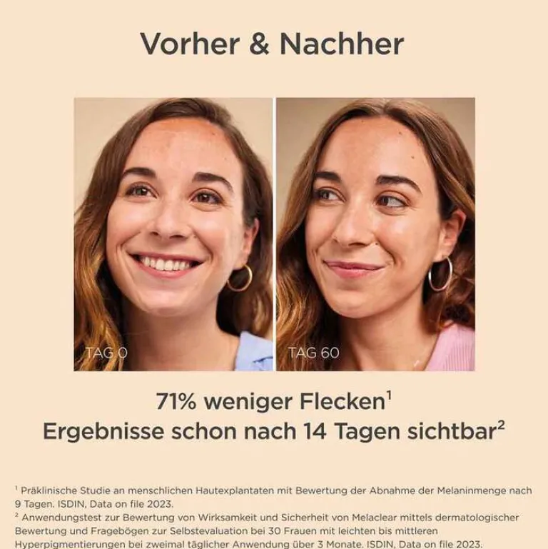 Melaclear reduziert die Sichtbarkeit aller Arten von Pigmentflecken** deutlich und schnell, zudem ist es für alle Hauttypen geeignet.