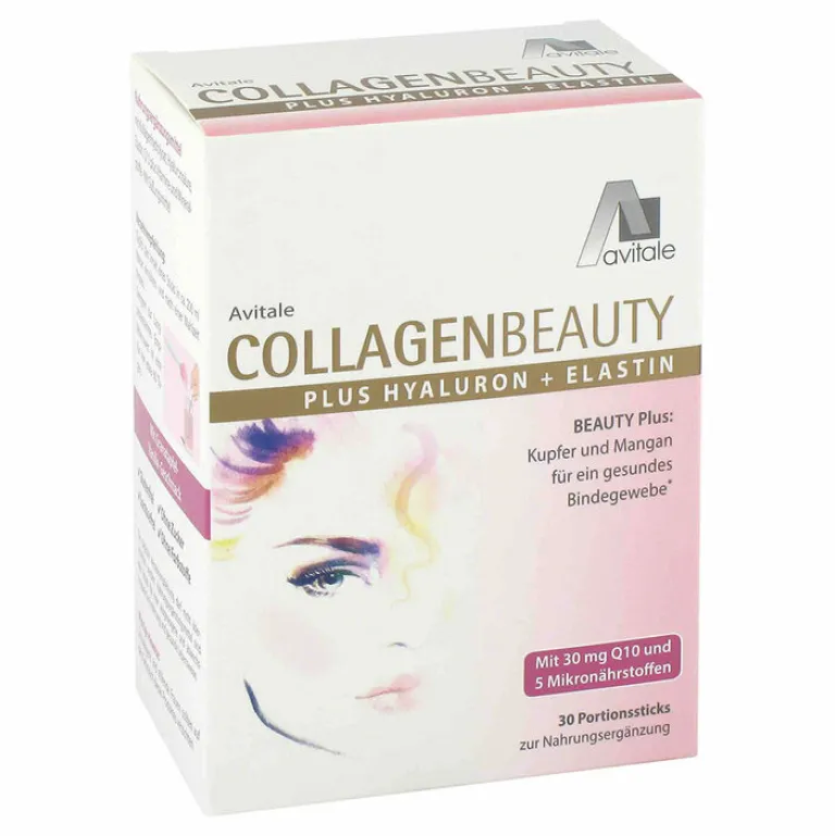 Collagen Beauty plus Hyaluron + Elastin Sticks ist ein Nahrungsergänzungsmittel. Die Portionssticks enthalten Kollagen, Hyaluron, Elastin und Q10 sowie das Beauty Plus mit Kupfer und Mangan für ein normales Bindegewebe und Vitamine und Mineralstoffe zur Erhaltung einer normalen Haut, normaler Haare und normaler Nägel.*