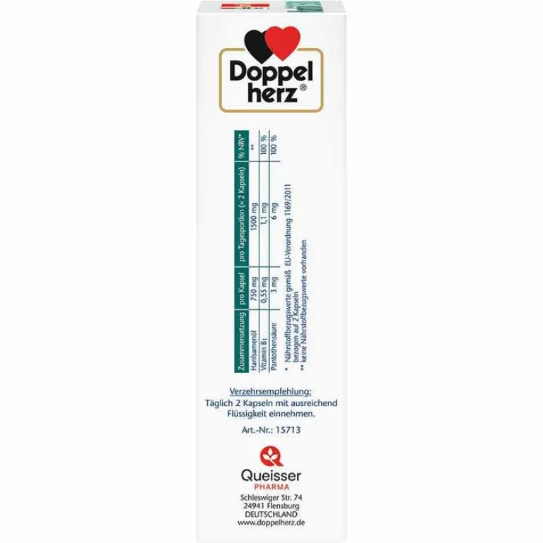Pro Tagesportion (2 Kapseln) sind in den Doppelherz Hanföl Kapseln 1500 mg Hanföl, 150 mg Hanfpulver mit 1,1 mg Vitamin B1 sowie 6 mg Pantothensäure (Vitamin B5) kombiniert.