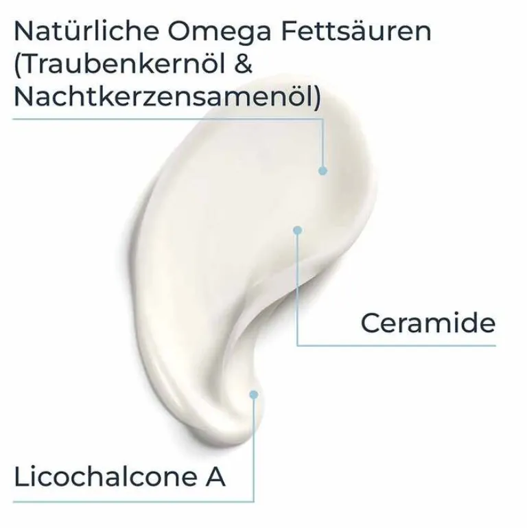 Die Hautcreme versorgt die Haut intensiv mit Feuchtigkeit, pflegt trockene Haut und sorgt für mehr Geschmeidigkeit. Die Formel mit pflegenden Inhaltsstoffen auf pflanzlicher Basis enthält hautberuhigendes Licochalcone A (Extrakt aus der Süßholzwurzel), natürliche Lipide wie Omega-Fettsäuren (Nachtkerzensamenöl, Traubenkernöl) und pflegende Sheabutter. Fehlende Lipide werden mit der Creme in der Hautbarriere ersetzt und sie hinterlässt ein intensives Pflegegefühl. Zudem wirkt die Body Lotion juckreizlindernd und kann so die Schlafqualität verbessern.