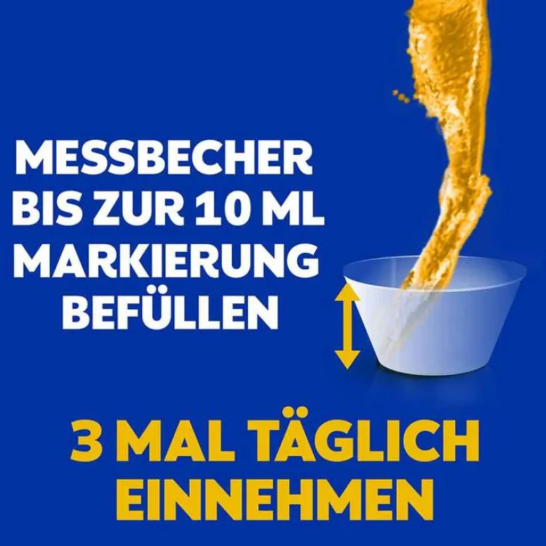 Erwachsene und Jugendliche ab 12 Jahren nehmen 3-mal täglich 10 ml (gemäß Markierung des Messbechers) ein. Nehmen Sie nicht mehr als die empfohlene Dosis ein.