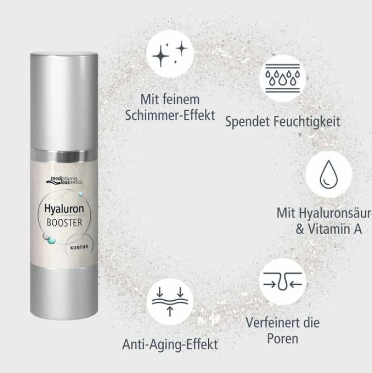 Der Hyaluron BOOSTER KONTUR mit wertvoller Hyaluronsäure in pharmazeutischer Qualität und Vitamin A strafft die Haut und polstert kleine Fältchen von innen auf. Die leichte Geltextur zieht schnell ein, hinterlässt ein seidiges Hautgefühl und sorgt für glattere Haut sowie einen strahlenden Teint.