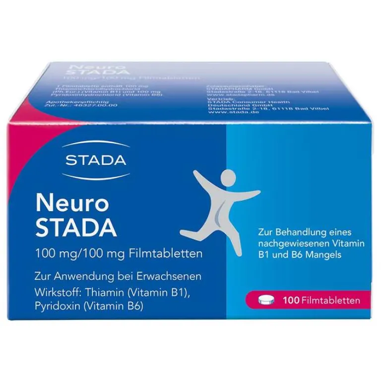 Neuro STADA® 100 mg/ 100 mg Filmtabletten. Zur Anwendung bei Erwachsen. Wirkstoffe: Thiamin (Vitamin B1), Pyridoxin (Vitamin B6). Zur Behandlung von neurologischen Systemerkrankungen durch nachgewiesenen Mangel der Vitamine B1 und B6. Zu Risiken und Nebenwirkungen lesen Sie die Packungsbeilage und fragen Sie Ihren Arzt und Apotheker. Zulassungsinhaber: STADAPHARM GmbH, Stadastraße 2-18, 61118 Bad Vilbel. Vertrieb: STADA Consumer Health Deutschland GmbH, Stadastraße 2-18, 61118 Bad Vilbel. Stand: September 2019