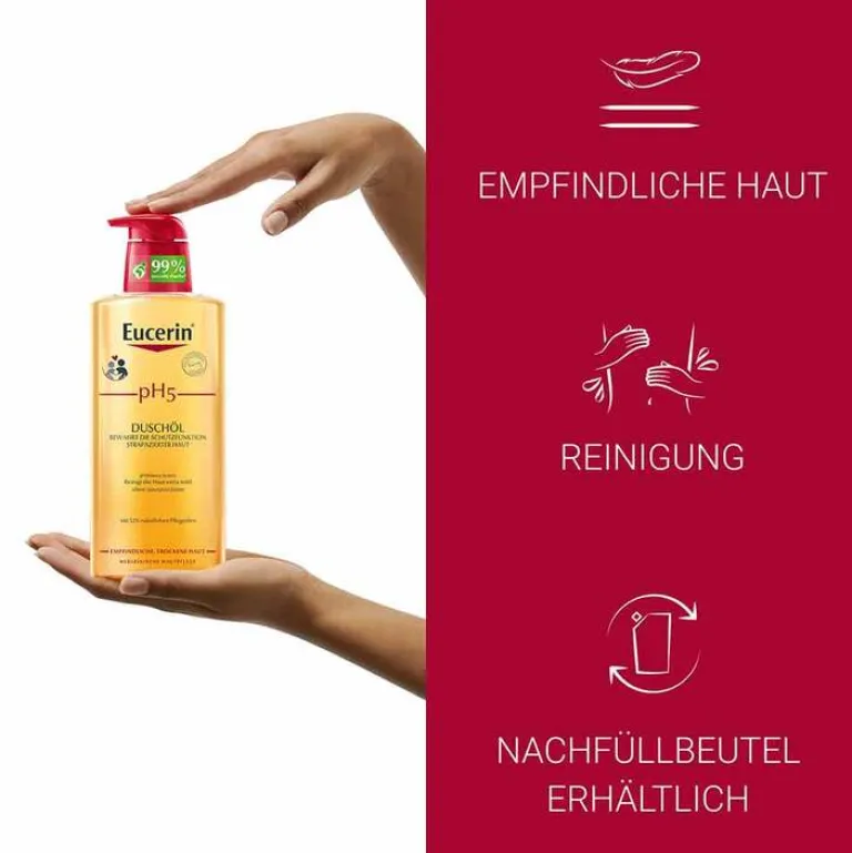 Eucerin pH5 Duschöl wurde speziell mit extra milden Tensiden zur Reinigung trockener, empfindlicher Haut entwickelt. Die Formel mit dem natürlichen pH-Wert und Dexpanthenol bewahrt nachweislich die natürliche Schutzfunktion und Widerstandskraft der Haut und reinigt sanft mit einem hohen Anteil natürlicher Pflegeöle.